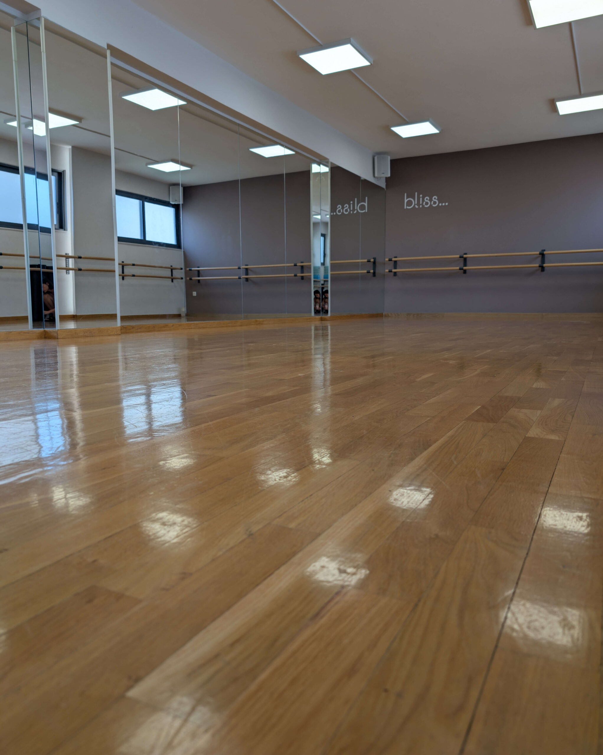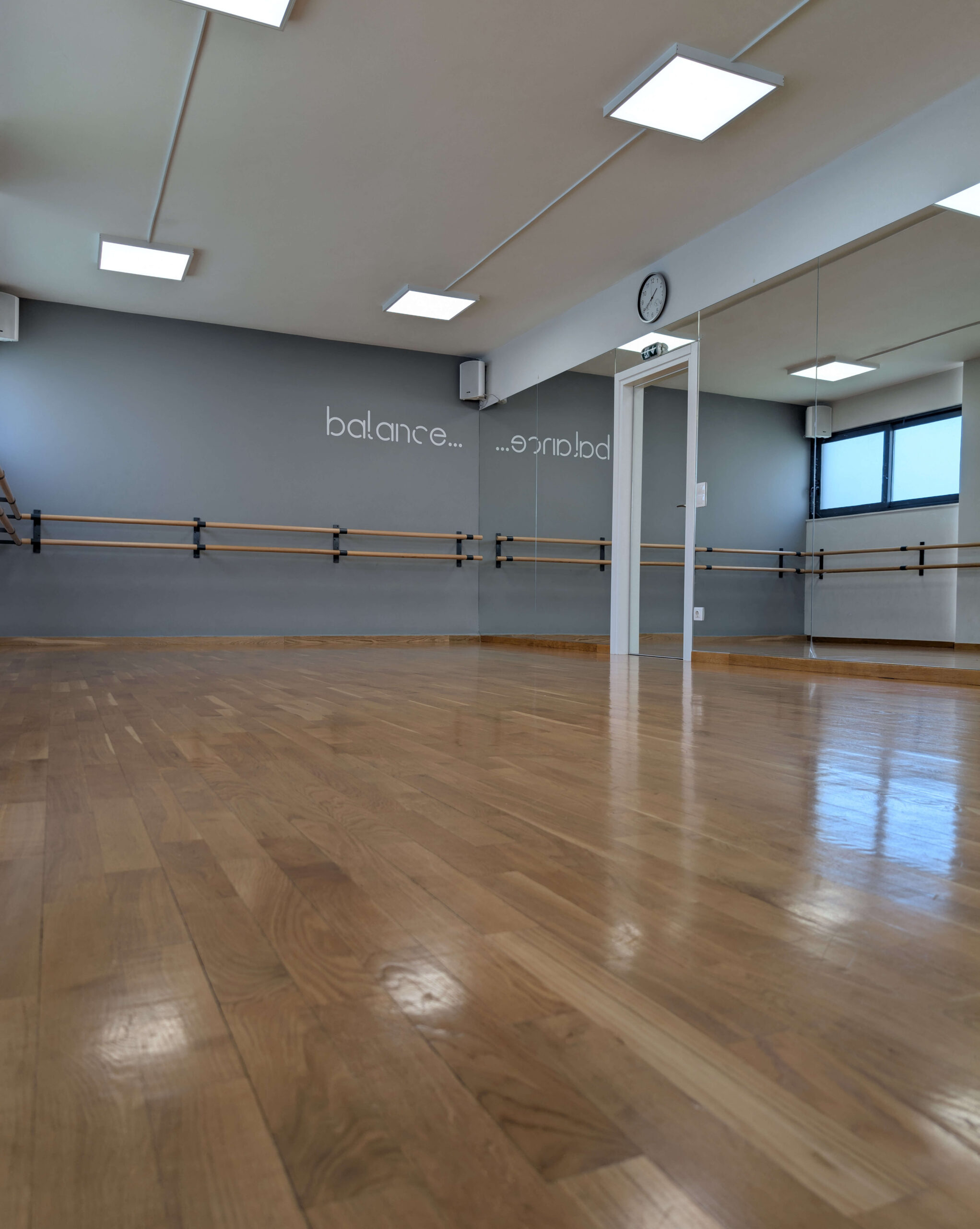 Στις αίθουσες το δάπεδο είναι μασίφ ξύλο, ειδικά κατασκευασμένο σε δοκίδες ώστε να υπάρχει η σωστή ελαστικότητα, στους καθρέπτες και στις τζαμαρίες έχουν τοποθετηθεί ειδικά φίλμ προστασίας.